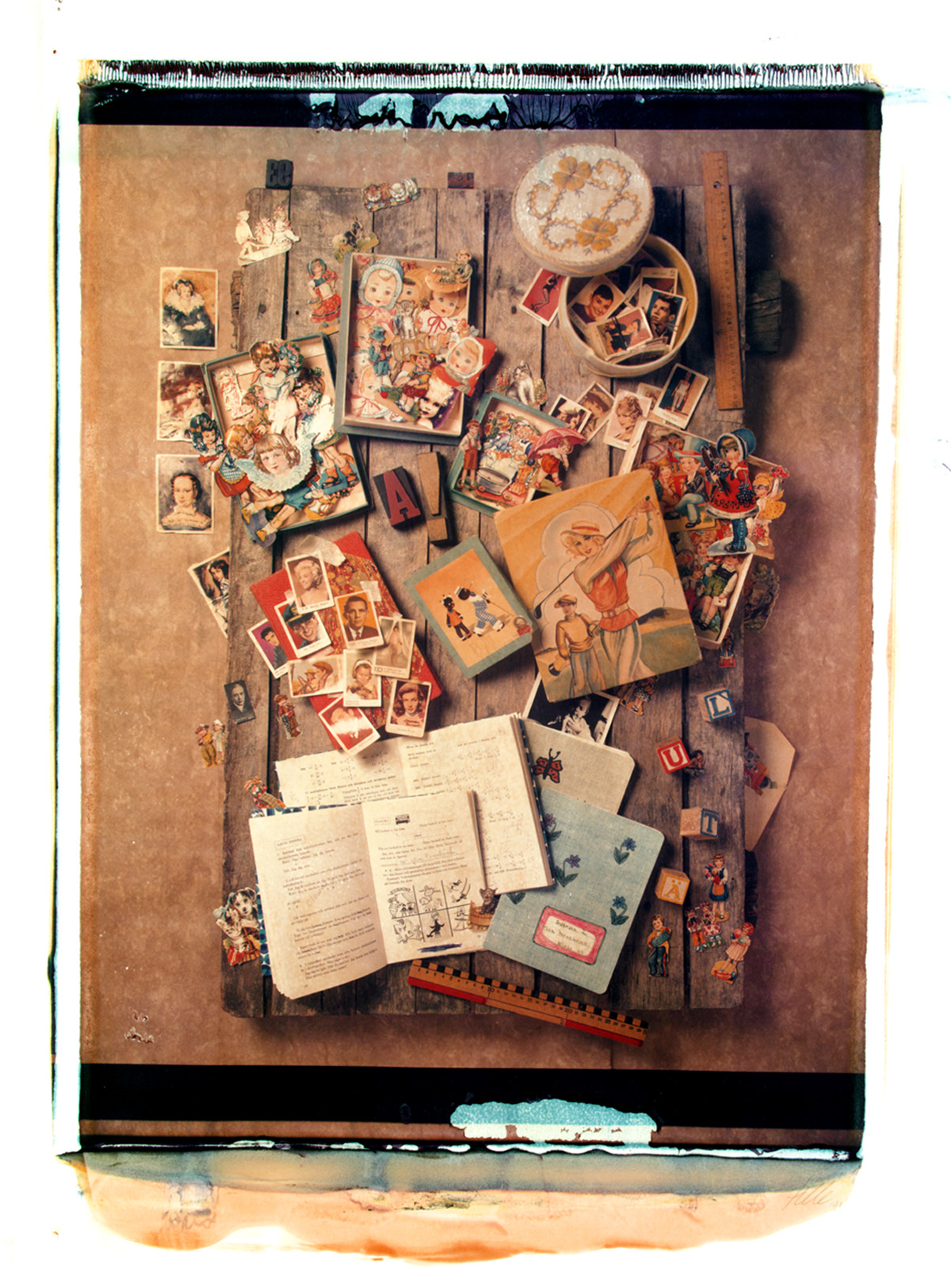My images with the 20×24″ camera were made in Stockholm using one of the very few Polaroid cameras that were traveling the world. It never went anywhere without an assistant. To be prepared for the event I made my sketches in 8×10″ on my studio floor. However, the Polaroid camera was huge and I had to nail and glue all my still lifes on a board leaning it to a wall. I just couldn´t tilt it as much as my 8×10″ camera. When you see the camera you will understand. I think the transfers I made with this camera are rare.